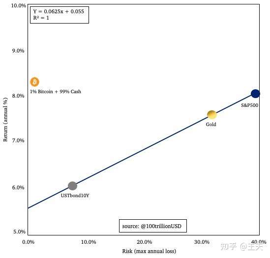 这里的X轴是风险,Y轴是回报,从收益来看比特币远超任何形式的金融资产。