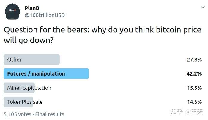 进一步 PlanB 又搬出了远期期货价格,也没有预示减半后会有价格的大幅上升,这是为什么呢?此时 PlanB 放出了自己在 Twitter 的调研:
