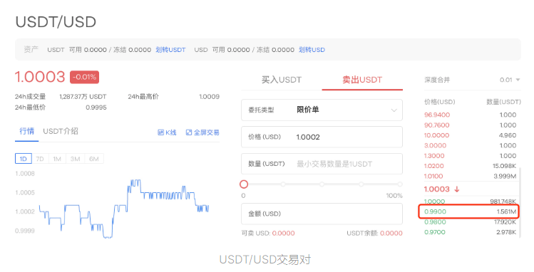 4、流程非常简单,充usdt或者其他token到自己的okcion账户,然后在换成usd交易对。个人推荐用usdt/usd交易对,深度相对足够,一次兑换$1.5M以内问题不大。