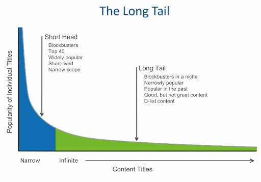 长尾理论主要试图指出,如果我们可以瞄准过去被忽视的长尾市场,又称“利基市场”(niche market),那么我们可能会惊喜的发现,这个狭窄而冗长的市场,其需求之和、整体利润足以与头部市场的总量相媲美。问题主要在于,服务这样一个狭长的、个性化的市场,对传统商业模式而言,边际成本是不经济的。但是互联网技术的发展使得我们可以建立规模化的计算机集群,24小时不间断的为极其大量的用户同时提供高度个性化的服务,而保持极高的服务效率和极低的边际成本。这就提高了商业效率,使得从利基市场中萃取大量微小价值成为可能,从而改变了只关注头部客户的传统商业模式。比如,Tiktok的服务器集群可以同时为全球上百万同时在线的用户各自推送完全个性化定制的内容,而新增一个用户所需要增加的边际成本低到几乎为零。这就是互联网服务和商业模式能够胜过传统商业模式的主要原因之一。