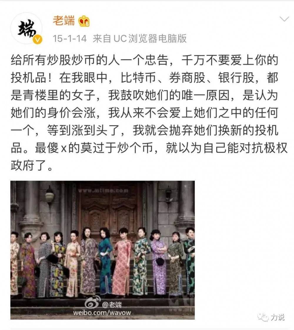 我们今天翻看端老师的微博,仍然可见他当年对比特币的嘲讽:青楼女子比特币。