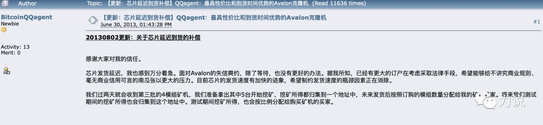 吴忌寒辞掉投资经理的职位,拉上葛越晟买机器建矿场挖矿,又买阿瓦隆的芯片自制矿机出售。bitcointalk上还有他当时出售矿机的帖子。从这个帖子的措辞不难看出,吴忌寒对于“不讲究商业规则、毫无商业信用可言”的愤怒。芯片是矿机的核心,这也是他后来找詹克团的主要原因。