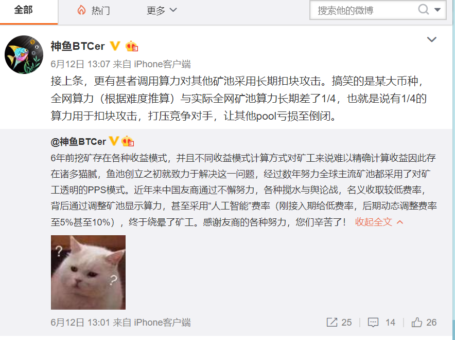 更有甚者调用算力对其他矿池采用长期扣块攻击。搞笑的是某大币种,全网算力(根据难度推算)与实际全网矿池算力长期差了1/4,也就是说有1/4的算力用于扣块攻击,打压竞争对手,让其他pool亏损至倒闭。