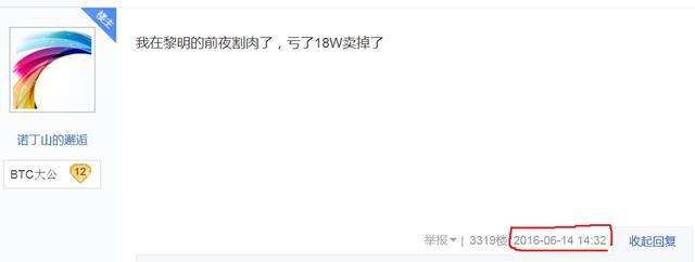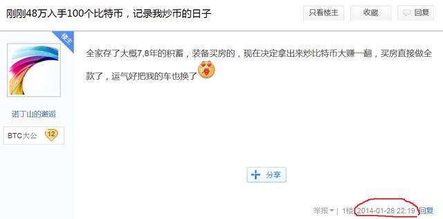 2014年,比特币贴吧有个人花了48万买了100个比特币,并开贴直播炒币,人称"48万哥"。期间,他的比特币市值一度跌到19万,9万,大家不停的挖苦他,说他即将变成"6万哥"。他的丈母娘为此事找他吵架,他的老婆甚至拿出离婚威胁他。最终在2016年初,他顶不住压力,割肉卖出了100个比特币,得钱30万,净亏损18万。倒在了黎明前。