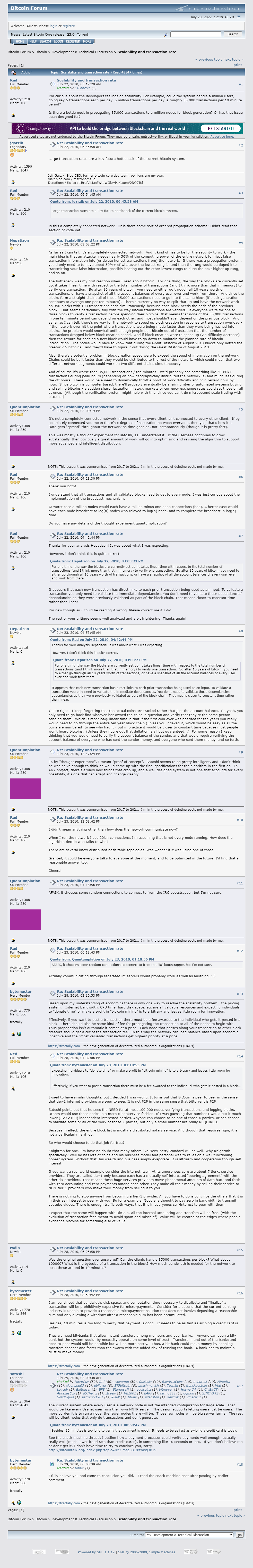 事情起因是这样的,2010年7月22日,网友Red发起帖子希望和大家共同探讨关于比特币的可扩展性问题。他表示非常好奇大家怎么看待比特币的扩展性以及性能,比如说这个系统能否支持100万个用户每天进行5笔交易?也就是说每天有500万笔交易,每10分钟大约进行3500笔交易,以比特币当前的性能可以承受得住吗?