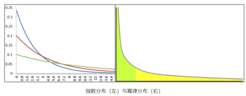 幂律分布区别于指数分布的特点是它的前后分布更为平均,数值下降速度更为“缓慢”。
