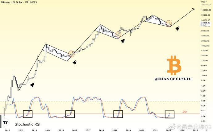 4.RSI指标,比特币月K线,每次RSI蓝线回到20以上的时候,比特币都会走出熊市,正式宣布进入牛市,目前,正式突破。(见图4)