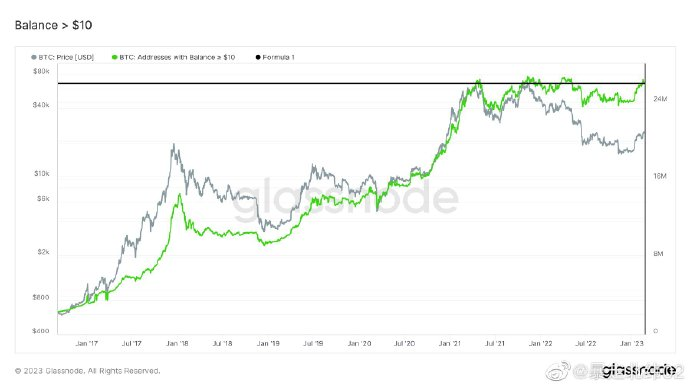 1.即使比特币再最高点跌了63%,但余额>10美元的地址数量,却达到新高的位置。此指标表示了比特币的采用率,一直为看涨信号。(图1,黑线为价格,蓝色为余额>10美元的地址数量)