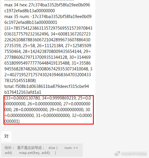bitcoin硬核玩家@迦楼罗王2010 ,用js编了一个程序,对1开头的bitcoin地址进行测试。通过检测循环58^i与58^(i-1)的临界点(即每位满58进位,跟其他进制一样),来计算base58编码后的地址中,34位、33位……地址数量占总体地址数量的百分比。