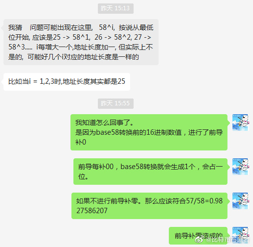 根本原因:base58转换前的16进制数值,进行了前导补0,每补一个0x00,base58转换就会多生成1个,从而会占多占1位。如果不进行前导补零。那么就会符合57/58=0.9827586207。