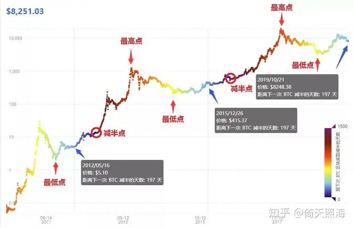 真正理解认同比特币的人支撑了比特币的最低价,币价上涨吸引来的投机者炒出了比特币的最高价,泡沫破裂后,比特币跌到支撑价,这个支撑价一次比一次高,比特币就这样一轮一轮地上涨。比特币区块奖励四年减半,供应量减少导致价格上涨,受此影响,牛市与之合拍,比特币就又呈现出四年一个牛熊周期的特点。随着市值升高,比特币每轮牛市上涨速度逐渐放慢,泡沫逐渐减少,牛市时间逐渐延长,波动逐渐缩小。