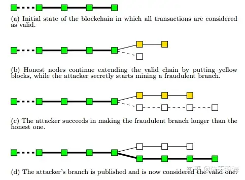 比特币确实存在一种叫51%攻击的威胁,意思就是如果掌握了全网一半以上的算力,就可以凭一己之力制造出最长链,进行双花攻击,或者打包空块,拒绝打包某些账单,或者别人打包了就凭算力优势分叉掉别人的区块。