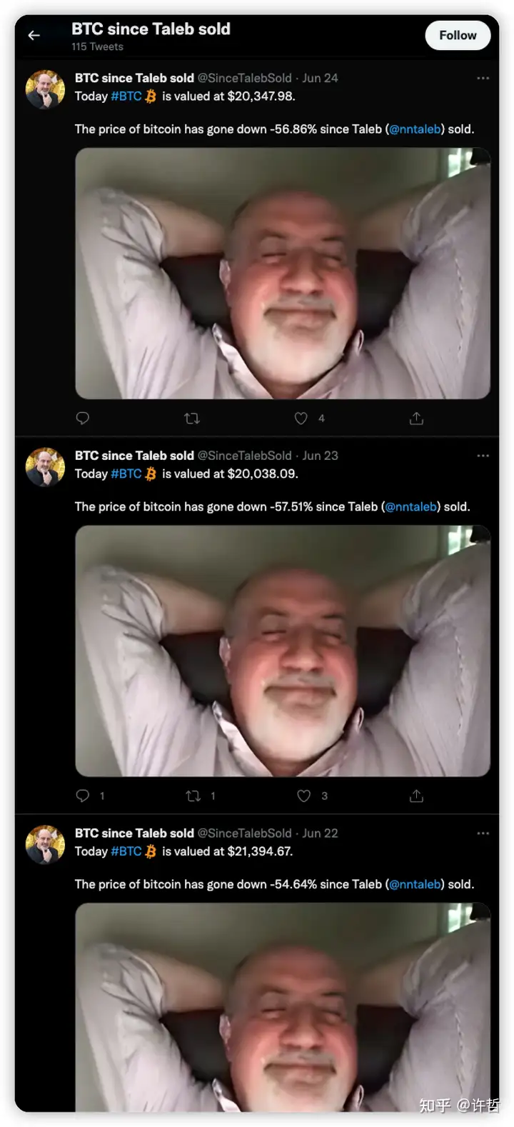 特勒布本人是个比特币大黑子,他卖比特币之后专门有人给做了一个账号。名字就叫“塔勒布做空了之后的比特币“,我们来看一下画风有多奇葩。