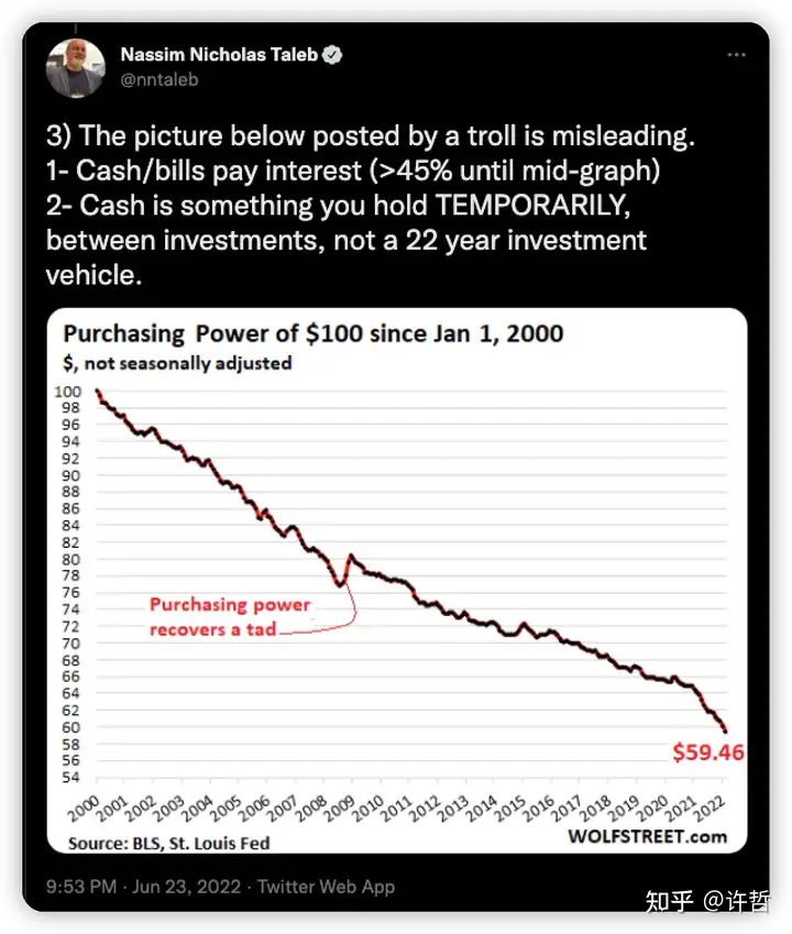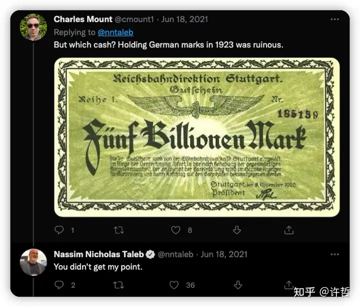 这个叫Charles Mount 的就典型杠精,说那要说1923年的马克抗不抗通胀啊。塔勒布遇到杠精也没什么办法啊。
