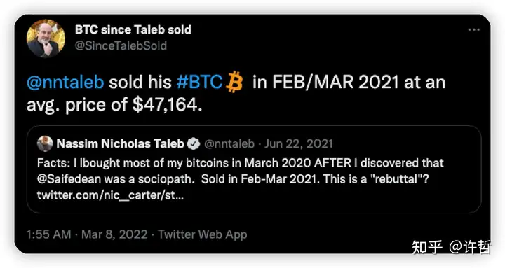这个是置顶推,意思是2021年一季度末,塔勒布以$47164的价格卖了比特币,然后。