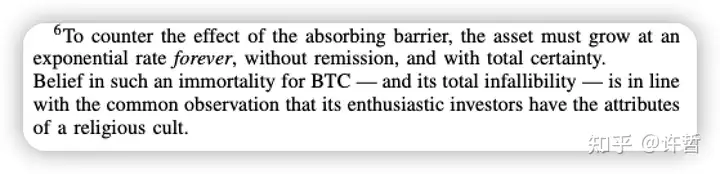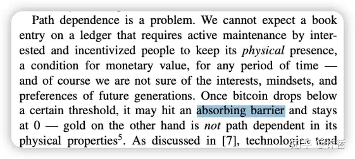 塔勒布的意思是作为一个非生息资产,这个玩意儿的物理实现(也就是挖矿),需要不断维持的话,就是一个不断提款的过程(矿工就算不卖额外的比特币,也需要支付电费)。那么一旦触及了维持物理现实的基础彻底不存在的一个币价,那币价会螺旋下降,就是一个死亡循环。关于这个虹吸效应,参考:许哲:勇于敢则杀,勇于不敢则活