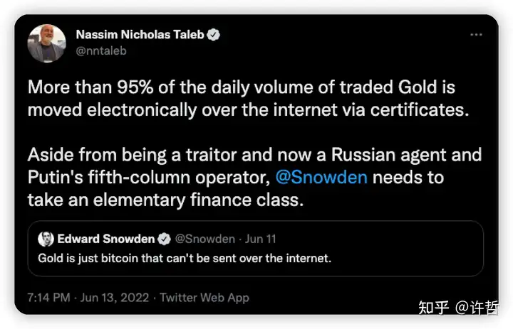 斯诺登发了推说黄金就是比特币,但黄金不能在网络上发(意思是比特币是更好的黄金)