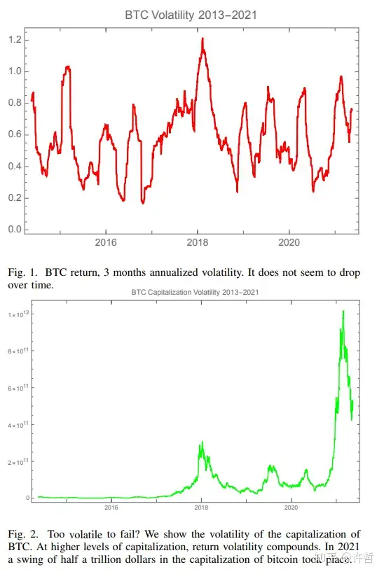 现在再来看比特币的波动率,图1显示比特币在其生命周期里持续产生了超高的波动率(年化大概60%到100%之间)更糟糕的是,其价格越高,使得它的资本化率更加动荡。