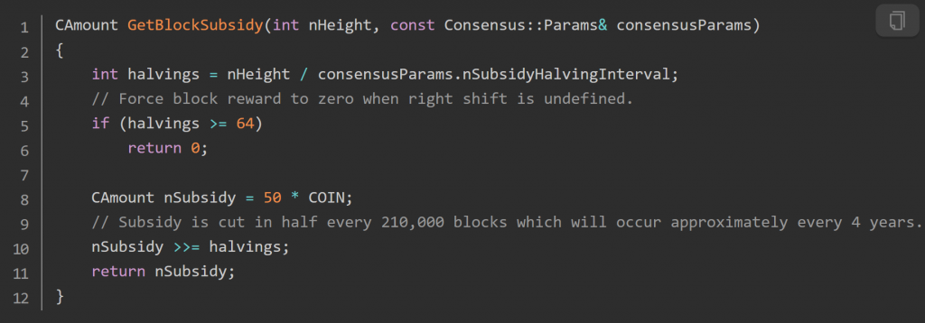 每经过21万个区块发生一次,第0到21万个区块,新币奖励是每块50,第21万到42万个区块,每块奖励25,以此类推。每一个区块大约10分钟,所以大约4年减半。但是所谓每区块10分钟,是一个动态调节的结果,区块是由算力竞赛的获胜者算出来的,全网矿工的算力越强,算得就越快,但按照规则,每隔2016个区块就根据之前的用时重新调节一下难度,让每个区块尽可能接近10分钟。所以说实际上看,由于比特币不断加速发展,所以平均每个区块的时间总是小于10分钟,减半的实际时间也就略小于四年了。