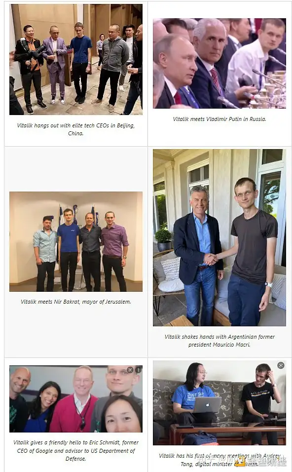 Vitalik在中国北京与科技CEO、在俄罗斯会见普京、会见耶路撒冷市长Nir Bakrat、与阿根廷前总统握手、向谷歌前CEO Eric Schmidt打招呼、与台湾数字部长Audrey Tang会面