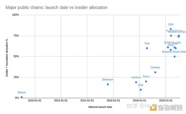 区块链行业渐渐用追求短期利润的价值观取代哲学和理想主义价值观的一个代理指标是,越来越大的预挖规模:加密货币开发人员分配给自己的份额。