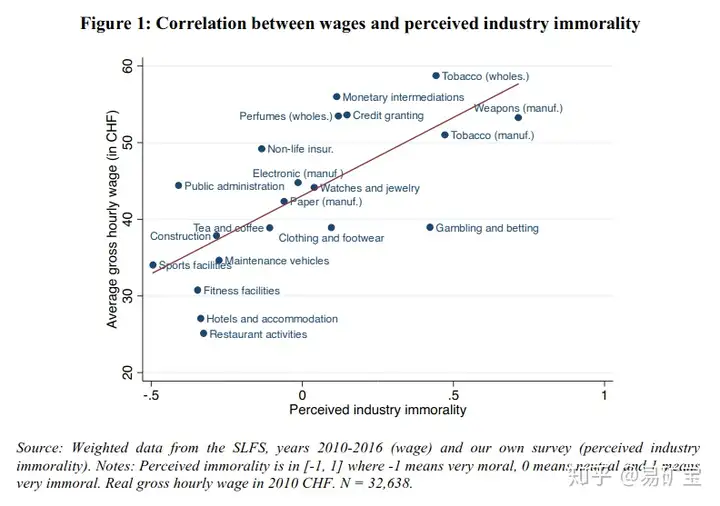 这些差异是非常有意义的,也是可以衡量的。举个例子,请看瑞士的这项关于不道德工作补偿差额的研究:如果一份工作被认为是不道德的,雇主要额外支付多少钱才能说服某人去做这份工作?