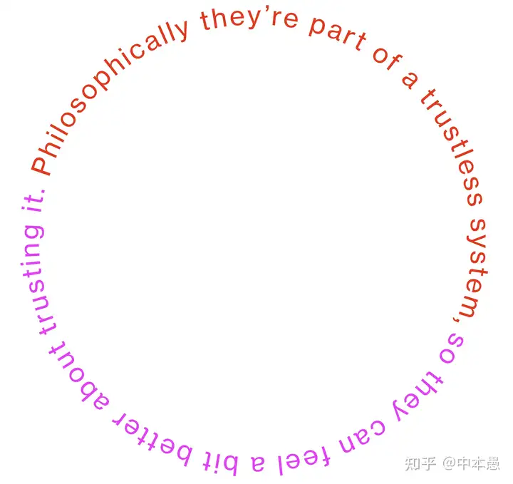 有时候他们就是不值得信任。有些银行不值得你信任,在有些地方,你不能信任法律能监管他们;有些政府不值得你信任,他们可能会没收你的银行存款、伪造选举结果,或改变产权登记册从而占领你的房子;有些社交媒体公司不值得你信任,他们会随意冻结你的账户。多数美国人大多数时候生活在一个高度信任的世界,信任这些中介机构是很容易且合理的。但不是每个人都生活在这样的环境中。