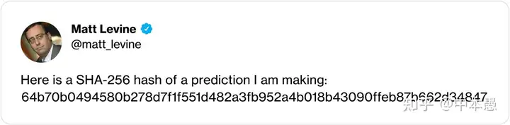 每个人都会说:“嗯,你真讨厌”,但他们无法解码你的预测。当喷气机队赢得超级碗赛时,你可以说:“看,我提前预言到了!”你可以重新发布加密推文和你的预测原文。如果有人愿意的话,他们可以通过散列计算器查到散列值真的与你的预测匹配,预测成功的荣誉将属于你。