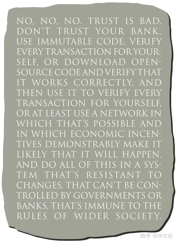 不,信任是不好的,不要信任银行,只有不可改变的代码才值得信任:验证你的每一笔交易,查看开源代码,确认他们是否正确,然后用它来验证你的每一笔交易;或者至少使用一个能够实现这些的网络,该网络能通过经济激励,为此带来可行性。并且,确保在一个能够抵抗变化、不被政府或银行控制、免疫于更广泛社会规则的系统中,完成所有这些。