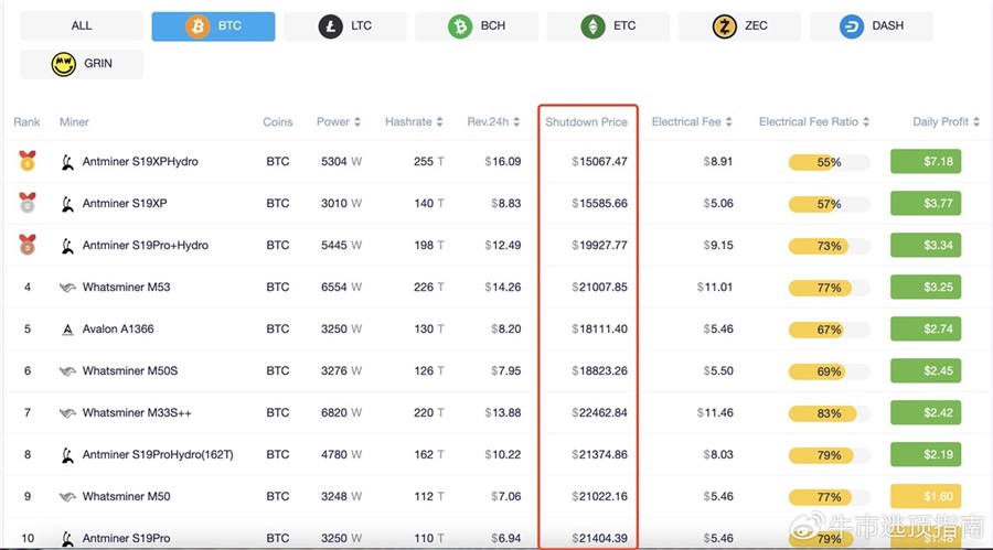 这个指标其实非常容易理解,通俗的说就是当矿工开机挖矿的电费比挖到的大饼卖出的价格还要高的时候,一些抗风险能力体量较小的矿工就会谋求退出止损。就会大批量的关闭矿机,因为开机了就会亏钱(电费)。