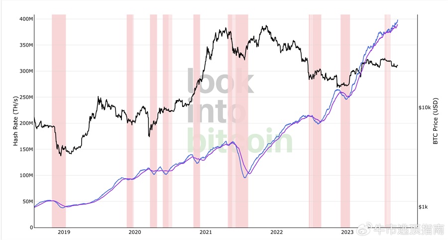 前面提到了矿工关机价指标,这边正好顺带就可以提一下和矿工关联的另外一个指标Hash Ribbons (哈希带)。哈希丝带(Hash Ribbon)是衡量矿工投降程度的工具。它由全网哈希率30天和60天的这两根简单移动平均线(SMA,Simple Moving Average)组成,当30天SMA低于60天SMA时,意味着矿工投降现象开始,市场看跌,以粉红色表示。当30天SMA回升至与60天SMA再度交叉时,意味着黑暗的时段已经过去,恢复期开始,市场看涨。