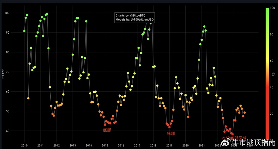 图表上的每个点代表一个月的时间,其得分是相对于前 12 个月进行评估的。RSI 的传统用法表明,70 或以上的值表明大饼正在超买,很有可能已经到达了顶部区域。RSI 读数为 45 或以下表明大饼已经超卖,很有可能已经到达了底部区域。