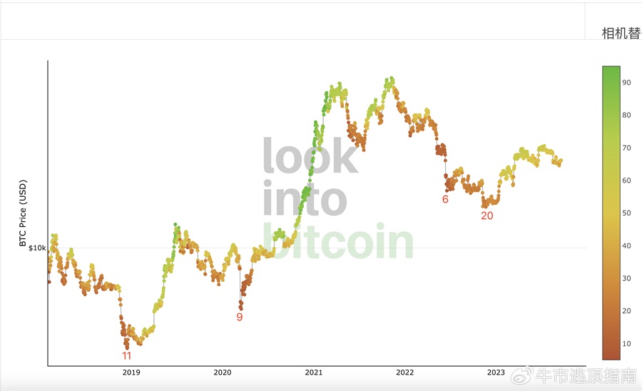 但是从图上可以看到,本轮恐惧贪婪指数最低的时候是6,但是价格对应的是1.9万,而最低1.5万的时候,贪婪指数对应的是20左右。所以该指标也有一定的误差区间,可以结合其他指标一起使用