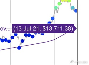 我们假设,记住只是假设2021年底达到蓝色区域,价格大概为1.577万美元便可以考虑分批抄底,但是如果随着时间越久达到蓝色区域,价格会随之被抬高,响应的抄底价格就会被抬高