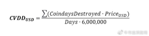 其含义为:当一个 hodler 卖给另一个 Hodler 时,交易的币当时交易时的价值/价格 (USD) 和之前的 Hodler持有币的时间长度乘积。CVDD 是每个链上交易的价值和时间破坏的累积总和。(可以理解为所有链上交易价格和上个hodler持有时间的乘积总和)
