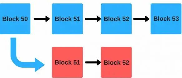 “分叉”大家应该都有所了解,毕竟之前比特币分叉的事情弄得沸沸扬扬的。下图中的红链就是从蓝链分叉而来的。设想51%攻击者在区块51中花了20个比特币买了其他数字资产,他们很容易就能在区块50进行分叉,又得到一个区块51。