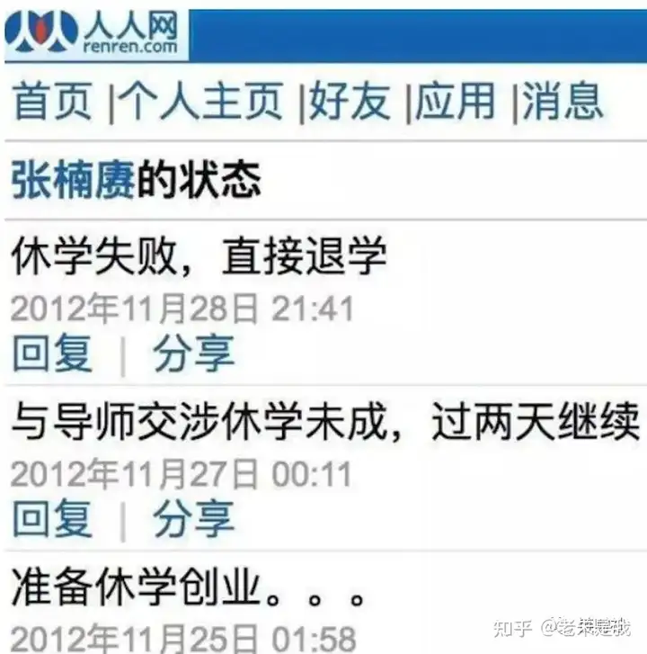 2012年11月,张楠赓遇到了技术瓶颈,他必须做出选择,不能再以半工半读的方式,继续这项副业。起初,张楠赓想与导师商量休学,但导师没有同意。2012年11月28日,张楠赓毅然决然地选择了退学。和大多数当时的大学生一样,他在人人网上记录了当时的状态。