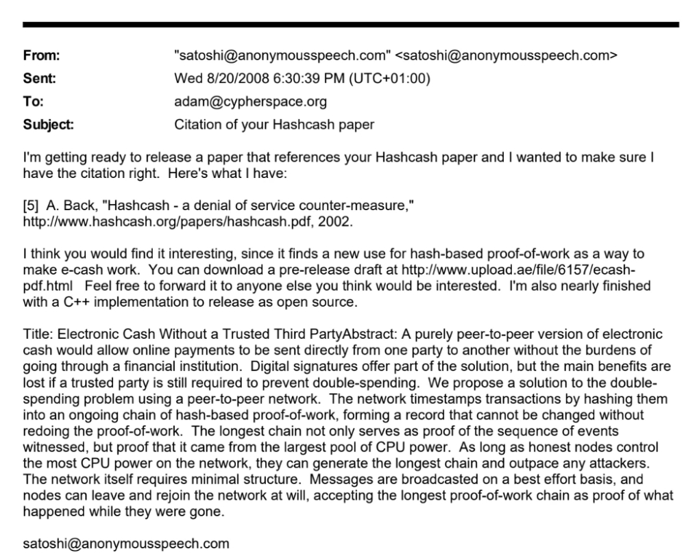 1. 下图为双方第一次(2008 年)的邮件记录,中本聪就引用 Adam Back 的关于 Hashcash 论文的通知函。从内容上看,熟悉比特币白皮书的人应该能发现,文中的大部分内容为比特币白皮书的摘要部分。