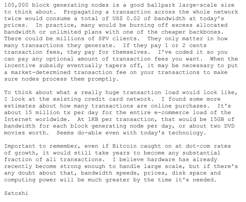 2. 中本聪就被问及未来比特币该如何扩展的问题时,中本聪给出的回答是:比特币网络最多将拥有 100, 000 个节点,并根据当时的情况进行测算以及论述大规模网络的经济性。(Rizzo 注:目前大约有 50, 000 个节点运行比特币客户端。)