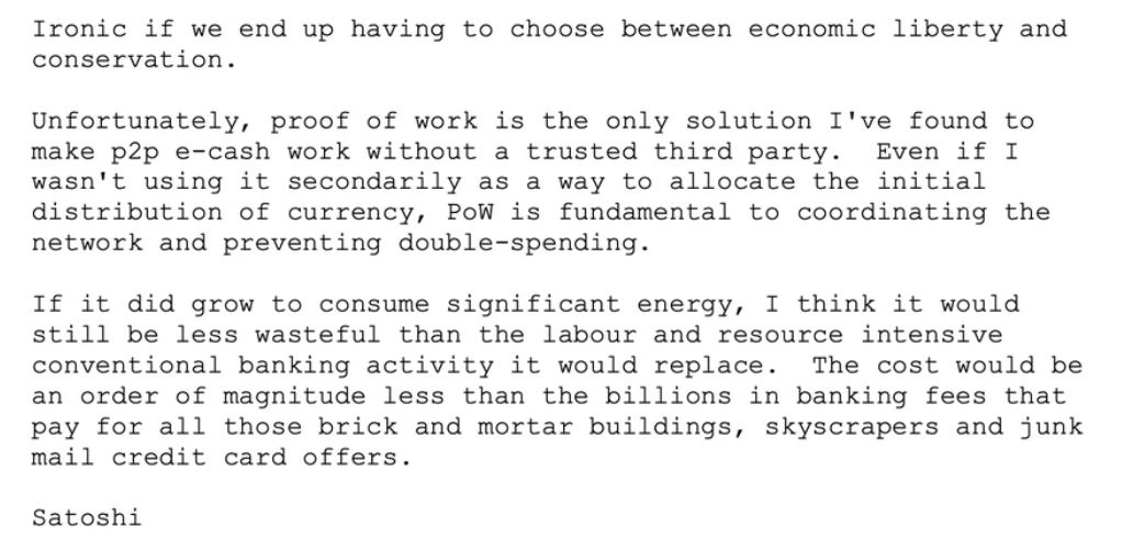 原文为“讽刺的是,我们最终可能不得不在经济自由和环境保护之间做出选择。不幸的是,我所找到的唯一解决方案是工作证明(POW),工作证明对于协调网络和防止双重支付至关重要。工作证明是使点对点电子现金系统能够工作且无需信任第三方的关键。