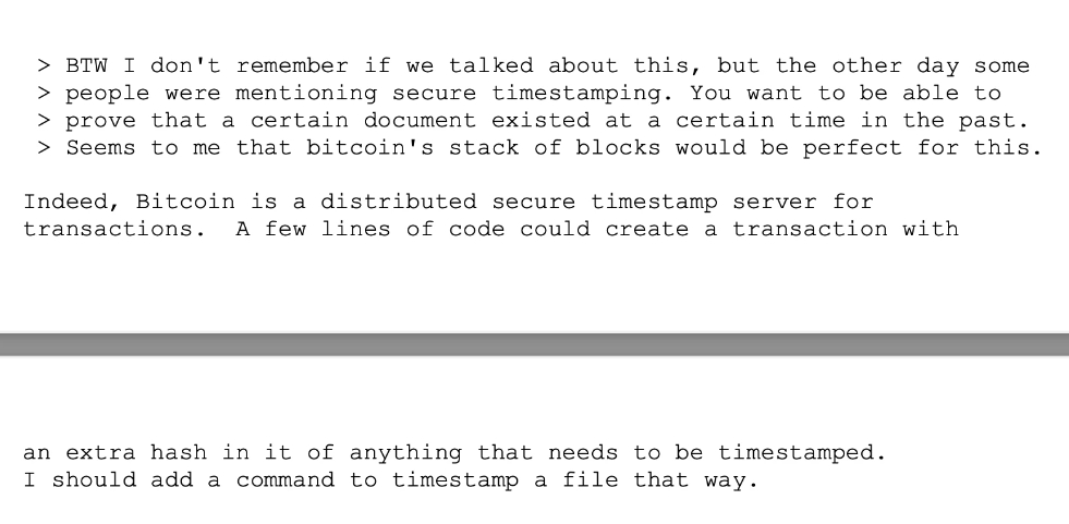 4. 中本聪预见到比特币至少有一种可行的非货币用途,支持时间戳用例。