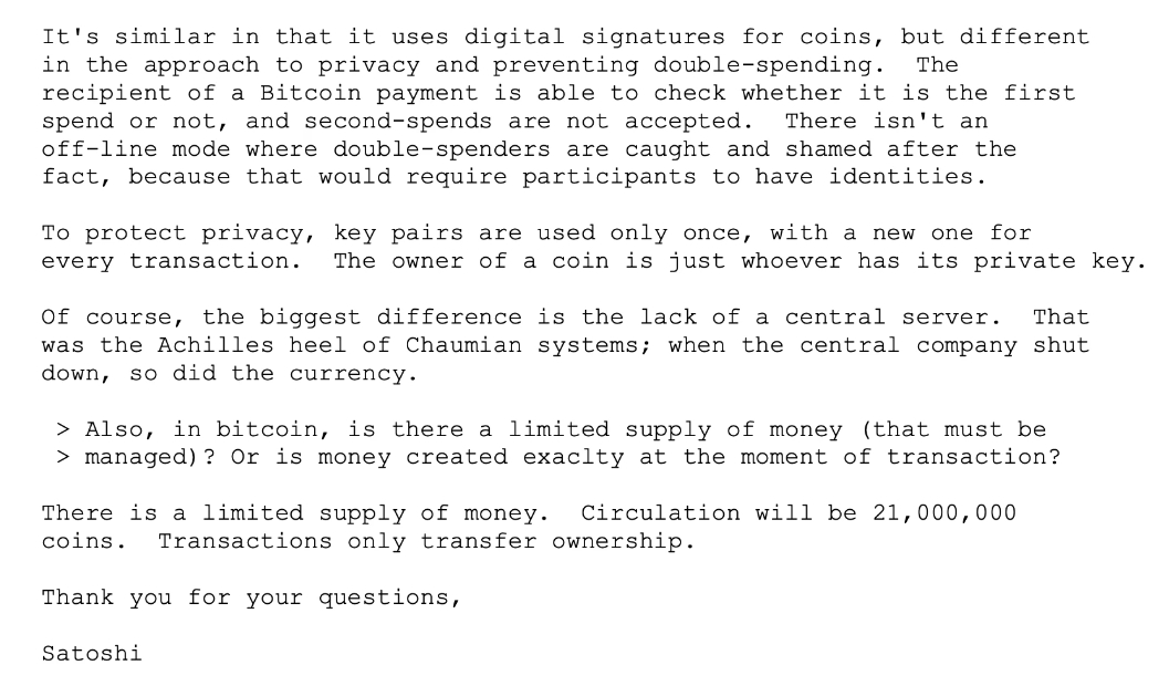 原文为“DigiCash 类似于使用数字签名来代表货币,但在隐私保护和防止双重支付方面有所不同。比特币支付的接收方能够检查是否为首次支付,如果不是,则不接受二次支付。不存在后期捕获和公开双重支付者的离线模式,因为这将要求参与者具有身份。为了保护隐私,密钥对仅被使用一次,在每次交易中都会生成新的密钥对。货币的所有者就是持有其私钥的人。当然,最大的区别在于没有中央服务器。这是 Chaumian 系统的致命弱点,当中央公司关闭时,货币也会随之关闭。在比特币中,货币的供应是有限的。总量将是 21, 000, 000 个硬币。交易只是转移所有权。”