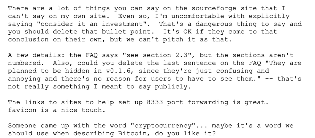 原文:“有很多你可以在 SourceForge 网站上说的事情,而我自己的网站上不能说。即便如此,我对明确地说‘考虑它作为一种投资’感到不舒服。这是一个危险的说法,你应该删除这个项目。如果他们自己得出这个结论,那就没问题,但我们不能把它当做这样来推销;有人提出了‘加密货币’这个词,也许我们在描述比特币时应该使用这个词,你觉得呢?”