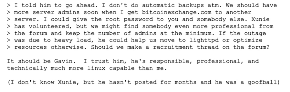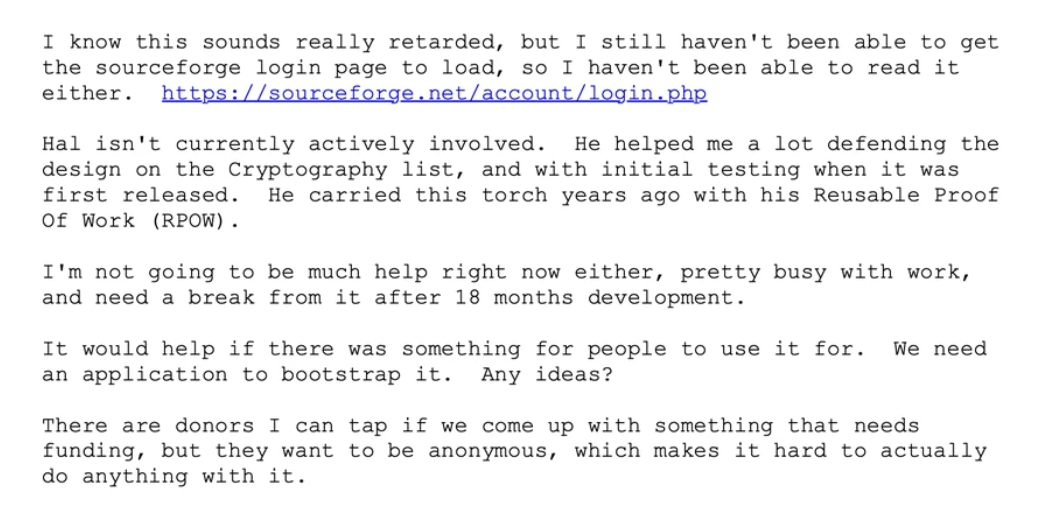 原文:“Hal 在密码学论坛上帮助我很多,对设计进行了辩护,但目前并不活跃参与其中。他在比特币最初发布时为其进行了初步测试。他多年前曾用他的可重用工作证明(RPOW)为这个领域贡献了很多。我现在也无法提供太多帮助,工作很忙,经过 18 个月的开发后,我需要休息一下。”