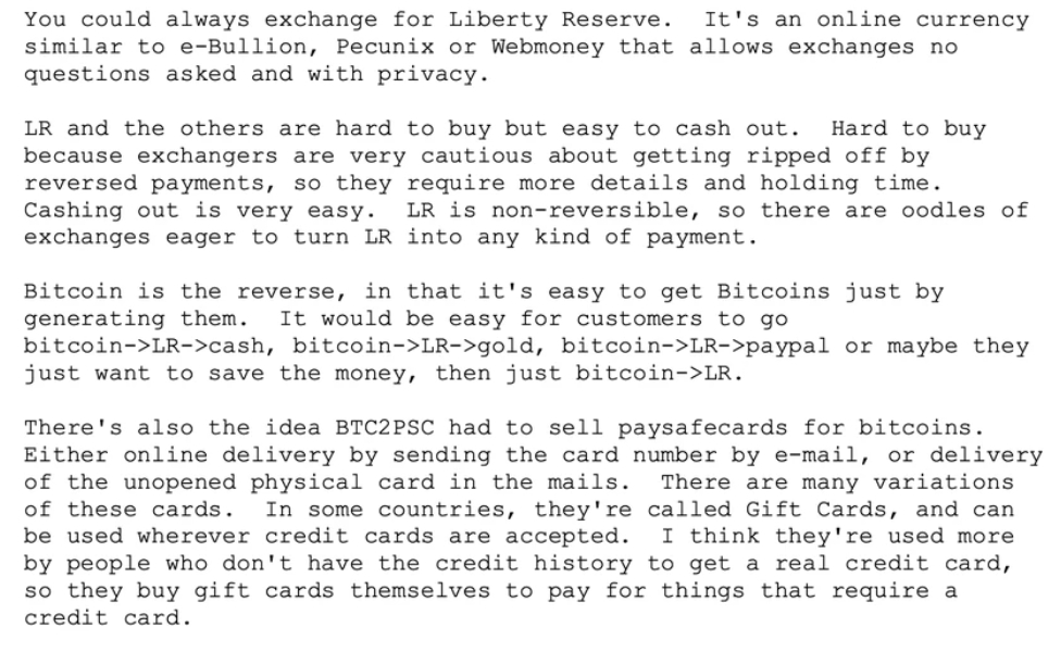 10. 中本聪认为比特币会成为交易其他互联网货币(如 Liberty Reserve)的一种方式。(Rizzo 注:Liberty Reserve 后来被美国关闭。)