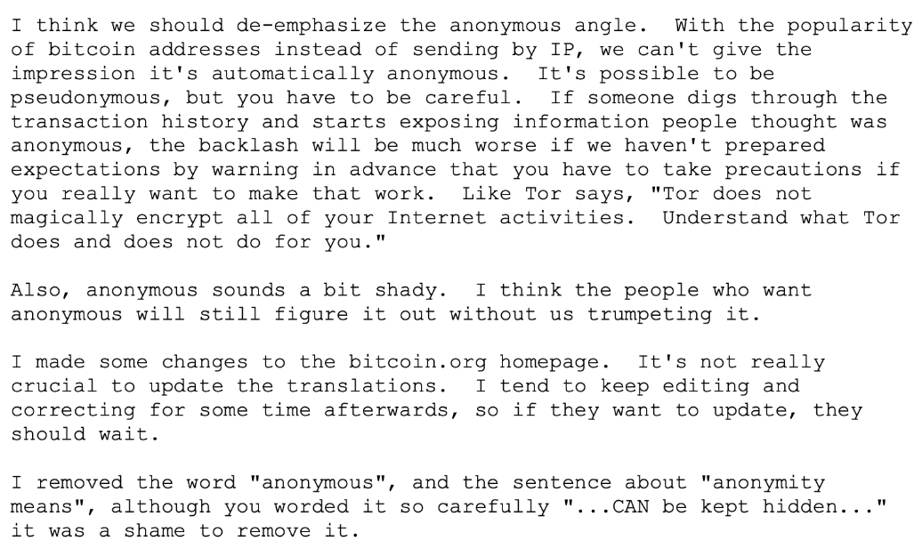 原文:“我认为我们应该减弱对匿名性的强调。随着比特币地址的流行,我们不能给人留下自动匿名的印象。如果有人深入挖掘交易历史,并开始暴露人们认为是匿名的信息,如果我们没有提前警告必须采取预防措施,那么后果将会更糟糕。就像 Tor 所说的,’Tor 并不能像魔术一样加密您的所有互联网活动。了解 Tor 为您提供和不提供的功能。’此外,匿名听起来有点可疑。我认为那些想要匿名的人会自己找出方法,我们不必大肆宣扬。”