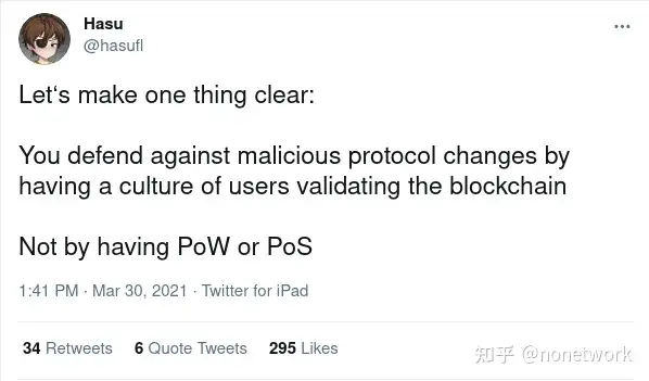 想象一下,如果用户正在运行验证链的节点(无论是直接验证还是通过更高级的间接技术),并且自动拒绝违反协议规则的区块,即使超过 90% 的矿工或质押者支持这些区块。如果每个用户都运行一个验证节点,那么攻击很快就会失败:一些矿池和交易所会分叉,但这么做看起来相当愚蠢。但即使只有一些用户运行验证节点,攻击也不会为攻击者带来干净利落的胜利;相反,它会导致混乱,不同的用户会看到不同的链。至少,随之而来的市场恐慌和可能持续的连锁分裂将大大减少攻击者的利润。在如此旷日持久的冲突中运行(区块链)的想法,其本身就阻止了大多数攻击。