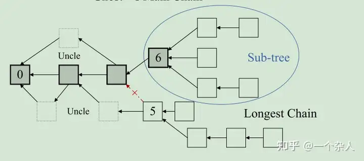 如上图所示,蓝色圈的部分为子树,这棵树的块个数为 6,而基于最长链的子树块个数为 5,被遗弃。链的增长递归的采用这种规则进行主链的选择,目的是为了用这种方式提升其安全性。