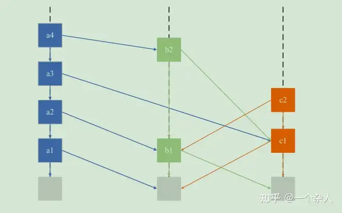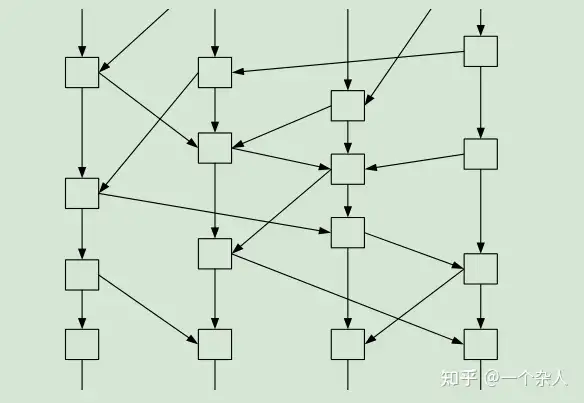 Hashgraph 是比较流行的,且典型的基于并行链的 DAG。在 Hashgraph 中,每个成员维持一个链,并且通过 gossip 协议与其它节点通信,通过随机介入(random access)的方式和邻居节点进行交互同步。