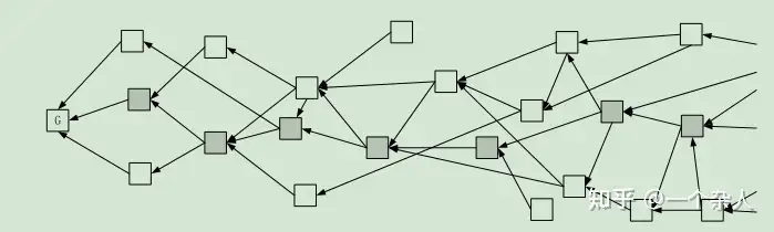 如图所示是 GHOST 的结构。它采用”可观察的贪心最重子树“(greedy heaviest-observed sub-tree)来替代最长链(Longest chain rule)从而选择出主链。